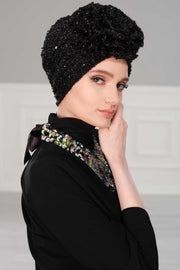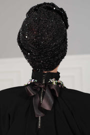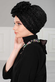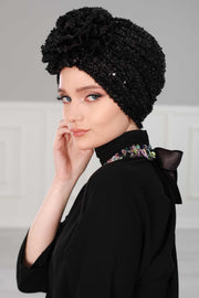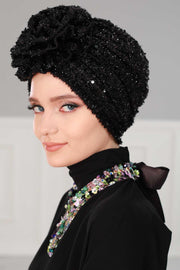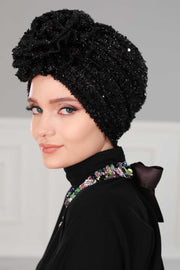 عمامة فورية من الترتر الأسود اللامع، غطاء رأس أنيق مربوط مسبقًا للنساء العصريات، قبعة كيميائية أنيقة مع زخرفة زهور، B-21SK