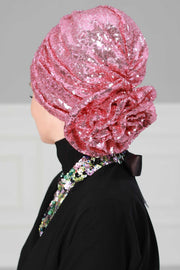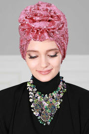 Glamouröser Instant-Turban-Hijab mit Paillettenrose für Frauen, funkelnde modische Hijab-Kappe, elegantes vorgebundenes Kopftuch mit großem, ausgefallenem Rosendetail, B-21P