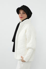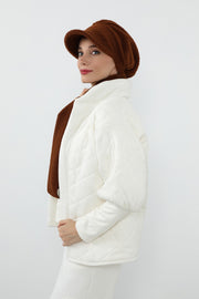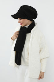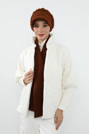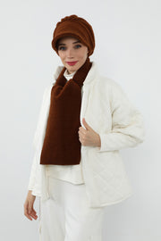 The turban features a modern visor detail that adds practical sun and wind protection while enhancing the silhouette with a chic, modest-friendly finish. The long, cozy scarf completes the look, creating a harmonious winter style that blends sophistication with everyday ease.