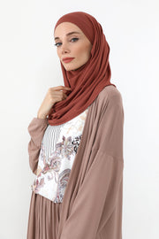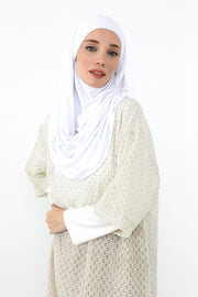 The built-in bonnet ensures a secure fit, keeping the hijab comfortably in place throughout the day, while the lightweight jersey drapes smoothly with a wrinkle-resistant finish. The face cover blends seamlessly into the design, allowing you to wear it with or without the veil according to your preference, offering both modesty and flexibility in one elegant piece.